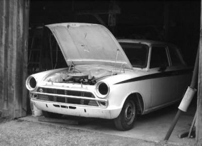 It had to be investigated closer. Sure enough... it matched what I remembered from my car books, it was a genuine Lotus Cortina. With cash in my pocket, I negotiated a deal (They offered to sell, minus the aluminum wheels- I said "I had to have the wheels to roll the car home.") Sold! A neighbor helped me tow it with a rope, 35 miles to my home in Rhode Island.
