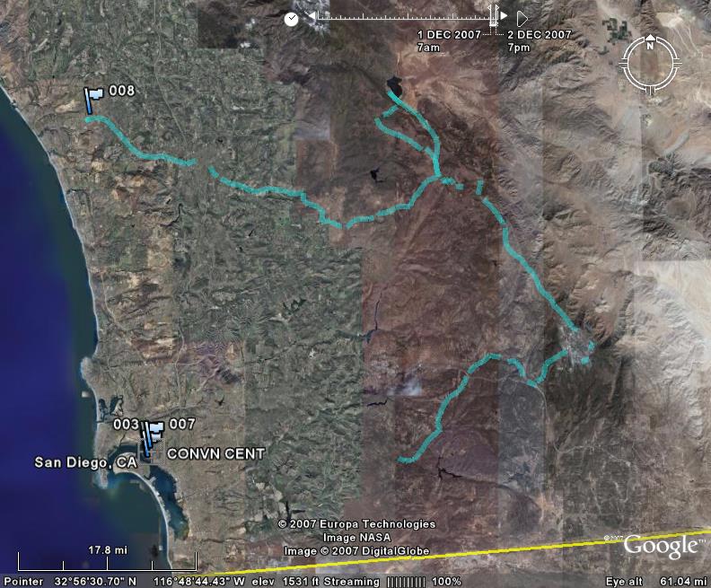 This is the route taken out of San Diego, from my hotel (flag 007 on the map), which was approximately 1 mile from the Convention Center, east towards Mount Laguna, north to Lake Henshaw, and back to Phil's home (flag 008), near the coast. Total driving distance- 186 miles. Later that evening, Mike gave me a final ride in the V-8 Cortina back to the San Diego Airport.