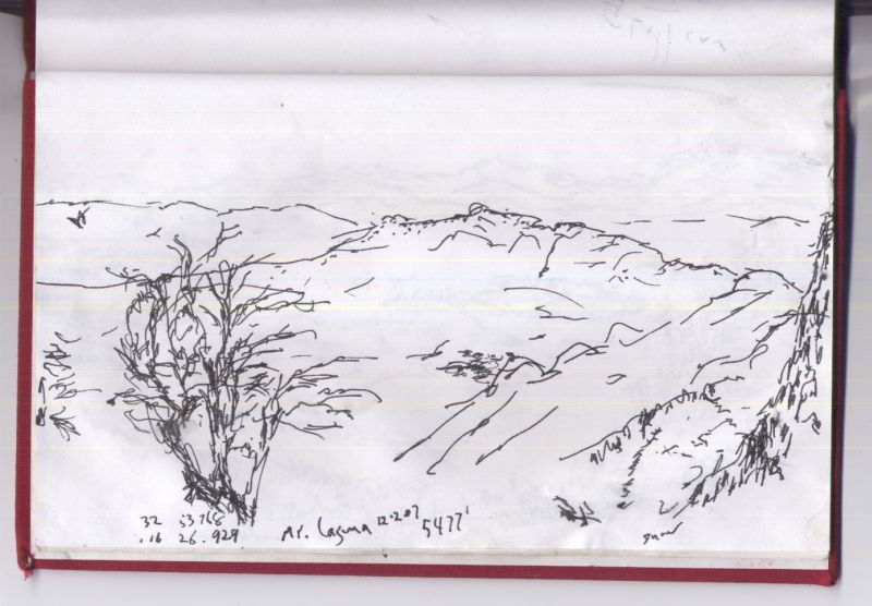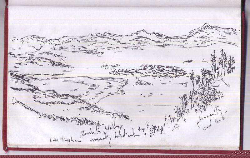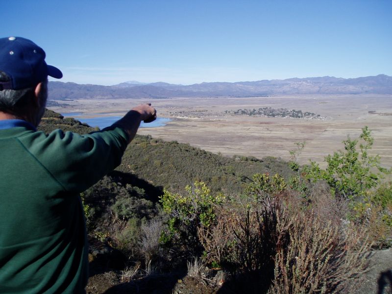 Mike points out Lake Henshaw (located in Ranchita valley) and explains how far the shoreline has receded due to drought. The large clump just right of center is usually an island surrounded by water from the lake. This lake can also be seen in the GoogleEarth image further below. Also, in my sketch, immediately below.