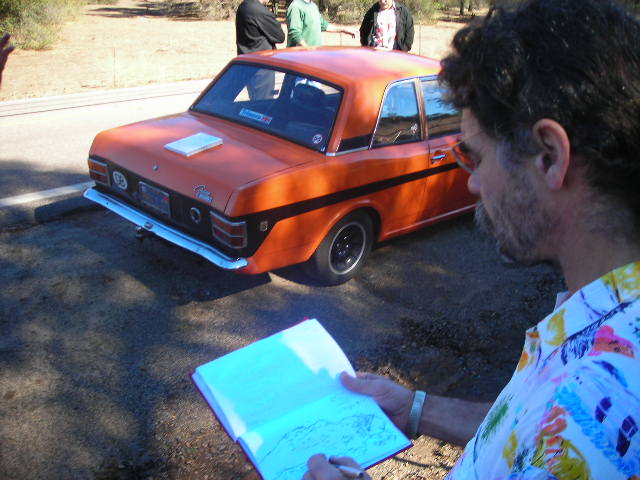 Doug took a picture of me sketching a rock-strewn hillside, while the 3 cars were parked on the side of the road. Phil's Cortina MKII is in the background.