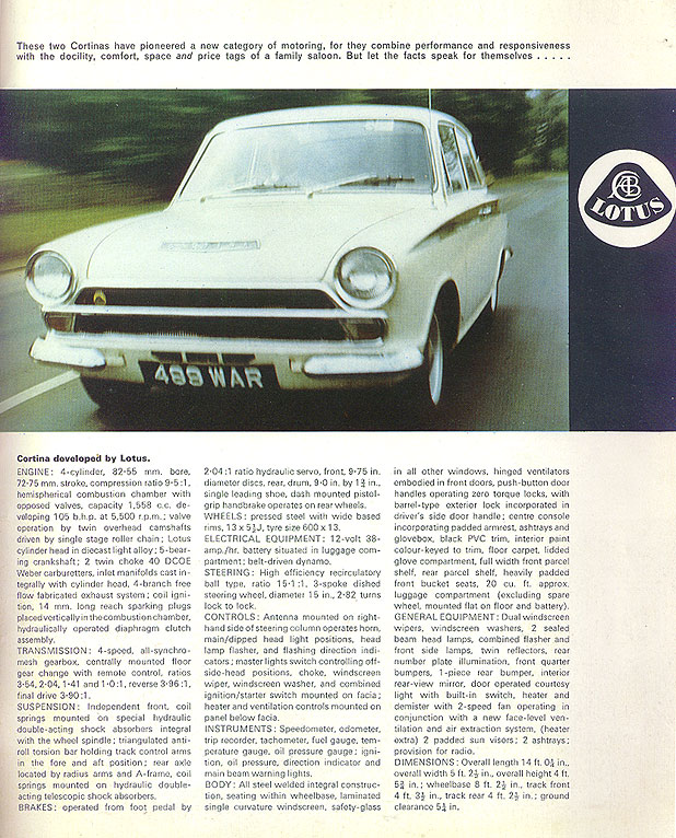 On the next to last page (inside back cover) is an interesting blurred action photograph of a Lotus Cortina, and 3 columns of text with descriptions of specifications and equipment. The section describing suspension states that the rear axle is located by ..."radius arms and A-frame, coil springs mounted on hydraulic double-acting telescopic shock absorbers." And with a full-width grille and flow-through ventilation. It does NOT mention light-weight aluminum body panels.