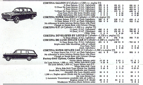 This is an 8 1/2 inch by 11 inch 3-fold 1-page flyer (folded size 3 3/4 inch by 8 1/2 inch), showing all passenger car models offered by Ford Motor Company Limited, showing small line drawings, and various factory-fitted options and prices.