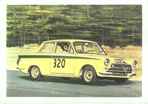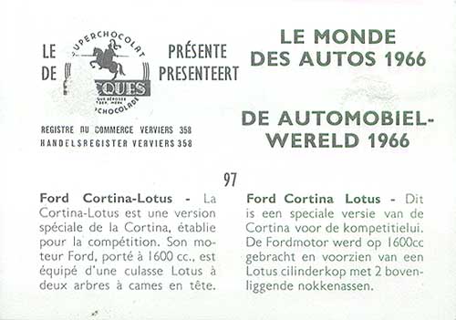 FORD CORTINA LOTUS on a JACQUES (Belgian chocolate) trading card, measuring 2.75 inches x 2 inches, numbered 97. This card could be found in the bars during the year 1966 as part of a series, with the title "Le Monde Des Autos 1966". On the backside is a 2-language (French and Dutch) printed description (pretty minimal) of the car. These thin cards seem to be very rare and hard to find.